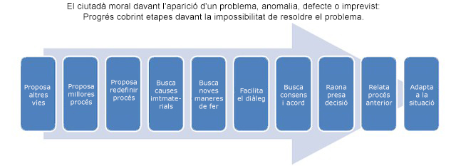 Davant d’una injustícia, com s’ha vist, el ciutadà moral intenta millorar les coses, oferint alternatives, innovant i generant oportunitats de millora. Mai es rendeix i, des del diàleg i el respecte, està buscant la millor manera de resoldre el problema. No busca el culpable, buscar les causes que han generat el problema. Les causes, segons la seqüència descrita d’atributs, primer es consideren materials, després són considerats inmaterials i, finalment, derivats de la presa de decisions.